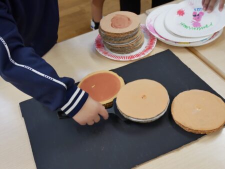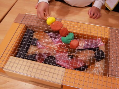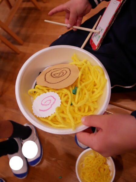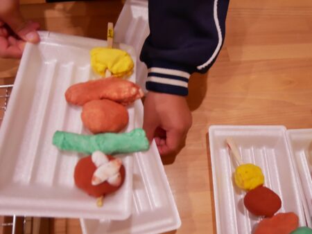 異年齢トリオチームで製作から始めて、お店屋さん役とお客さん役を交代で。